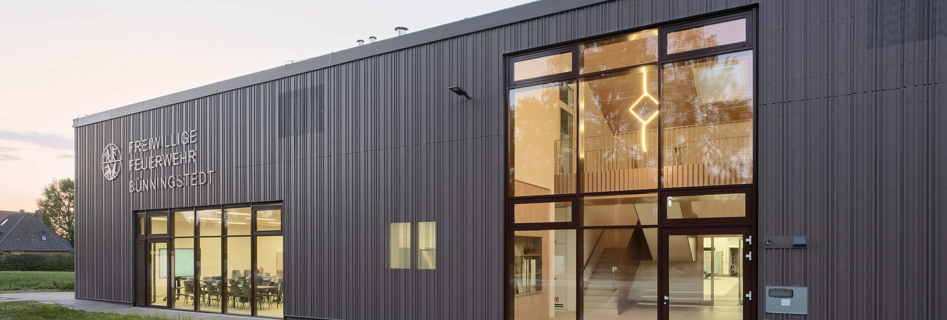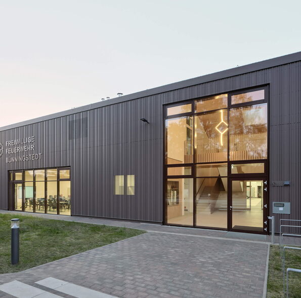 Der Ersatzneubau wird als 2-geschossiges Feuerwehrgebäude errichtet. Im Erdgeschoss befinden sich Werkstatträume, Umkleide- und Sanitärräume, die Fahrzeughalle sowie Schulungs- und Veranstaltungsräume im vorderen Bereich. Im 1. Obergeschoss befinden sich Verwaltungsräume, die Haustechnik, Lagerräume und ein Mehrzweckraum.