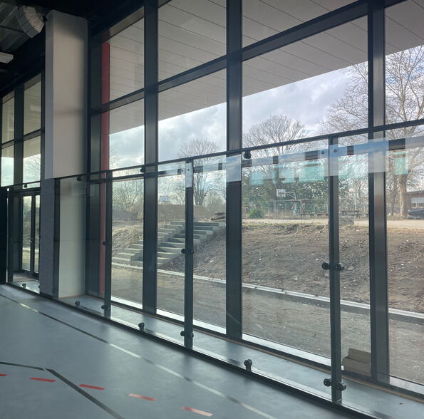 Die Sporthalle ist eine hybride Konstruktion, mit Bodenplatte und Stützen aus Stahlbeton. Die Wände gemauert und das Dach aus Trapezblech liegt auf auskragenden Stahlträgern auf. Die Dachkonstruktion wurde bemessen, um zukünftig auch eine Photovoltaikanlage tragen zu können. Dreiseitig ist die Halle bis zu 1,5m im Erdreich eingegraben. In diesen Bereichen ist eine Stahlbetonwand als Sockel gebaut.