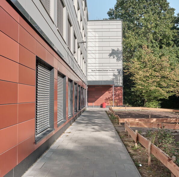 Das neue Schulgebäude an der Gyula Trebitsch Schule wurde nach dem Grundgerüst der Hamburger Klassenhäuser errichtet. Neben 23 Klassenzimmern mit Differenzierungsräumen und offenen Lernlandschaften bietet es im Erdgeschoss Platz für ein Lehrerzimmer, Berufsorientierungsräume, eine Bibliothek und sogar eine Fahrradwerkstatt. Dieses Gebäude lässt sich keinem der Standardtypen der Hamburger Klassenhäuser zuordnen, da der Fußabdruck noch größer als der des Typs C ist und eine Viergeschossigkeit auch nicht vorgesehen war.