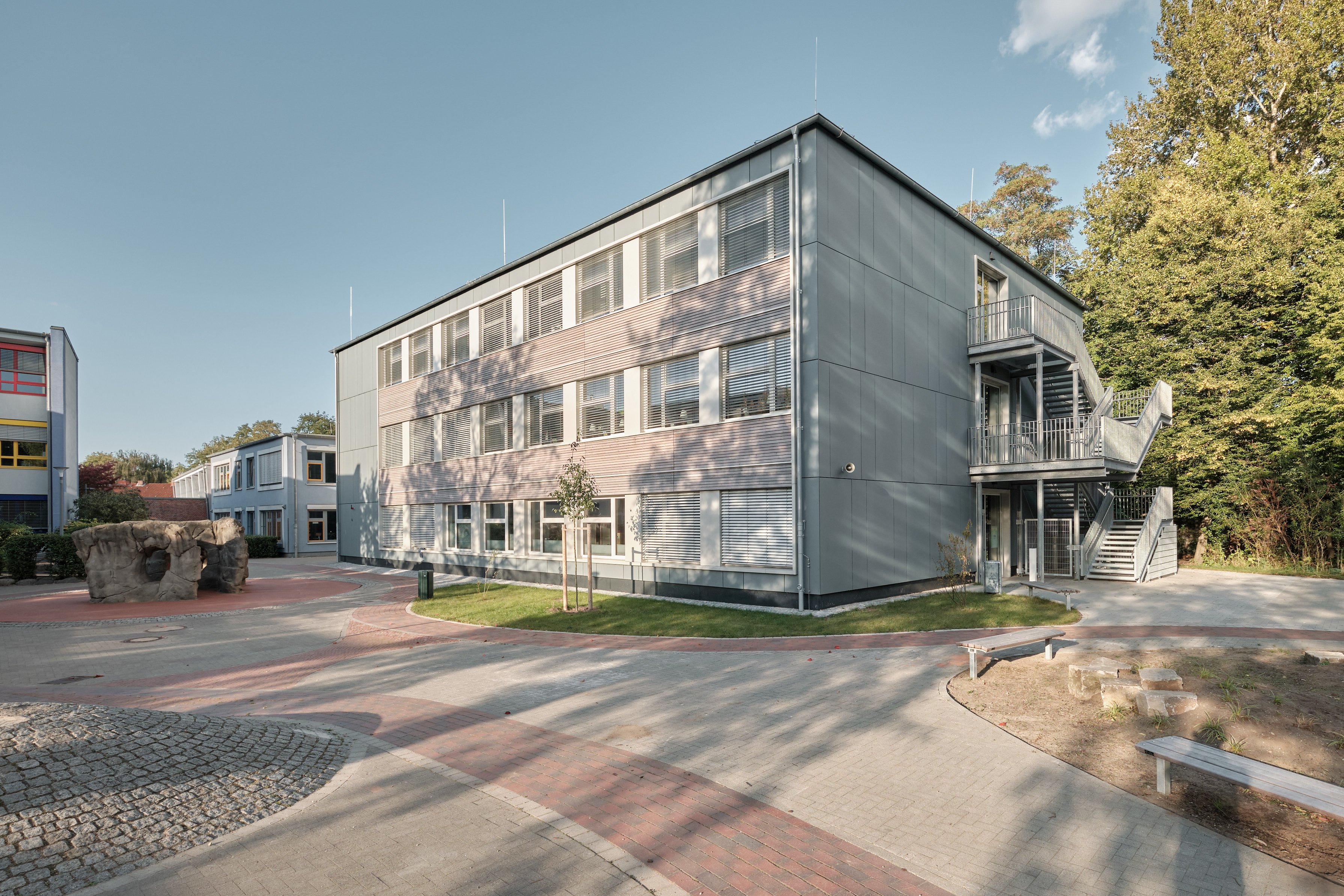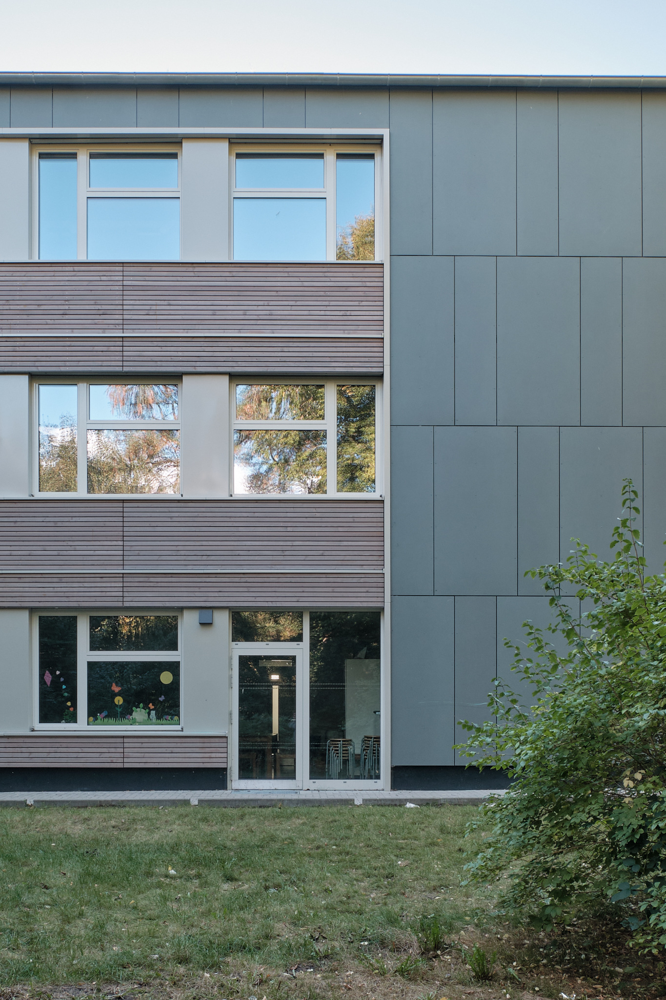 Das Hamburger Klassenhaus am Standort An der Berner Au ist eine Erweiterung der ansässigen Erich-Kästner-Grundschule. Neben Fachräumen bietet es vor allem Platz für Räume die der besonderen Förderung und Unterstützung der Schüler:Innen dienen. Das Gebäude basiert auf dem Typus 2.A mit der Besonderheit, dass es über eine Verbindungsbrücke im 1.OG mit einem der Bestandsgebäude verbunden ist.