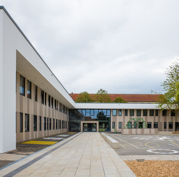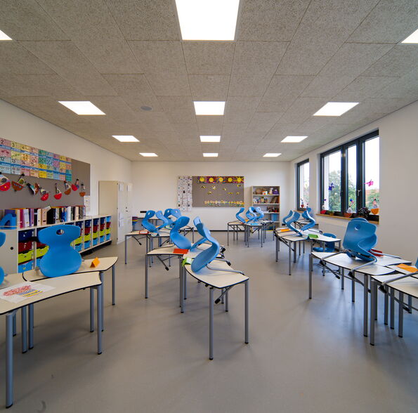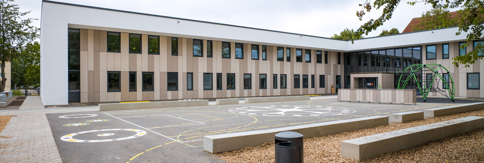 Der Hortbereich grenzt an eine 198 qm große Multifunktionshalle mit abtrennbarer Mensa und einer separaten Essensausgabe (30 qm).