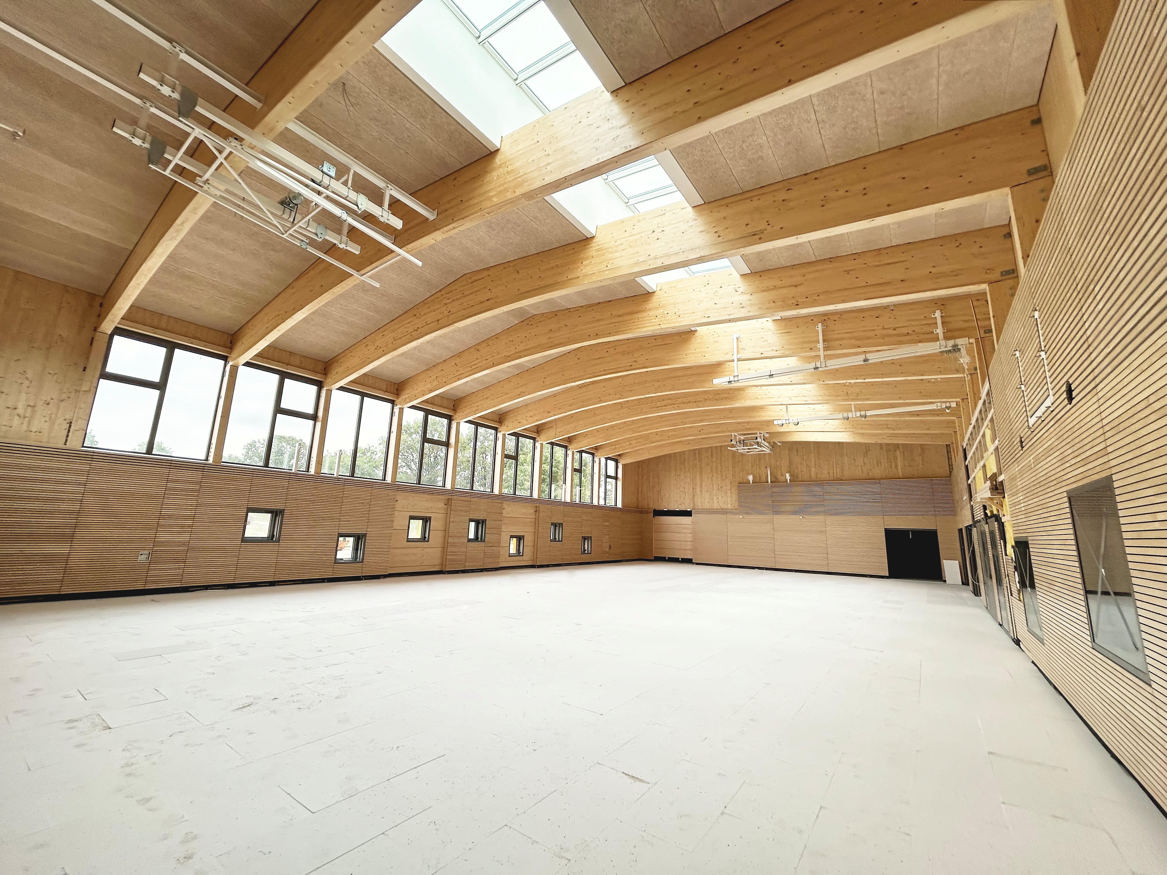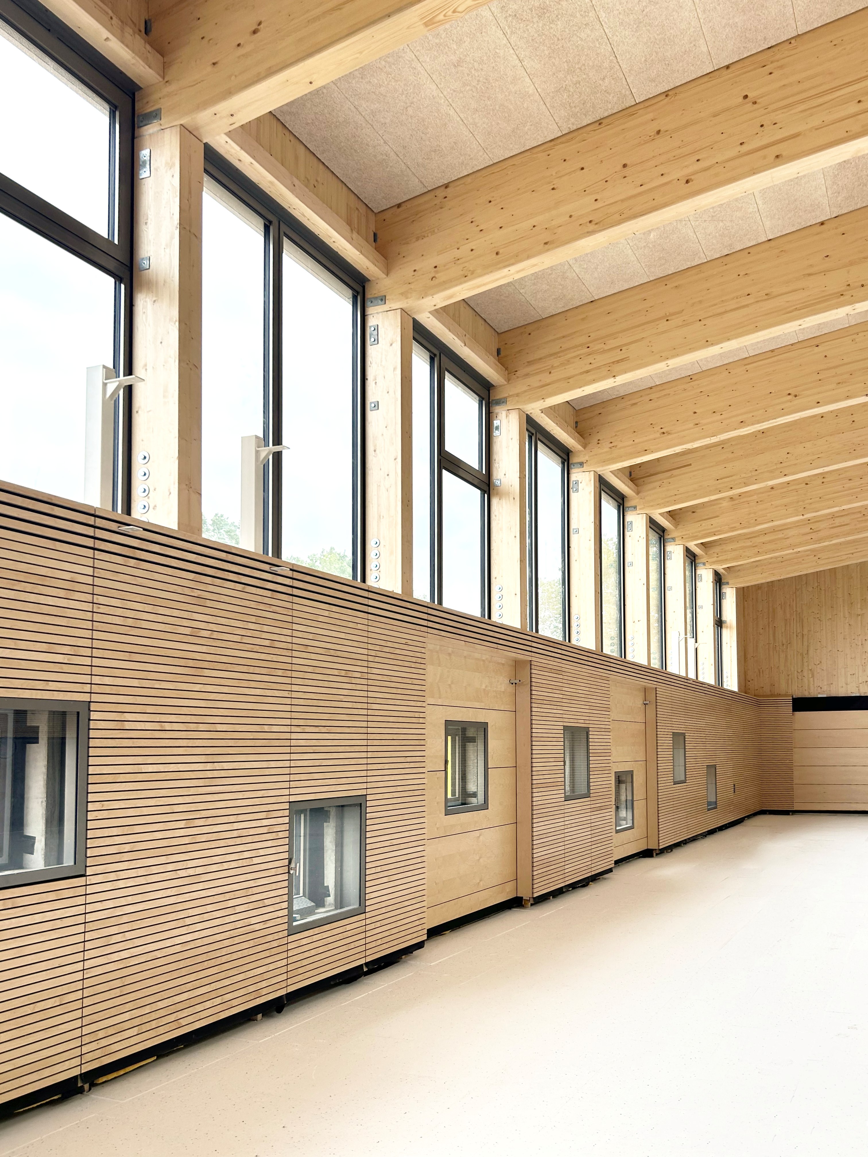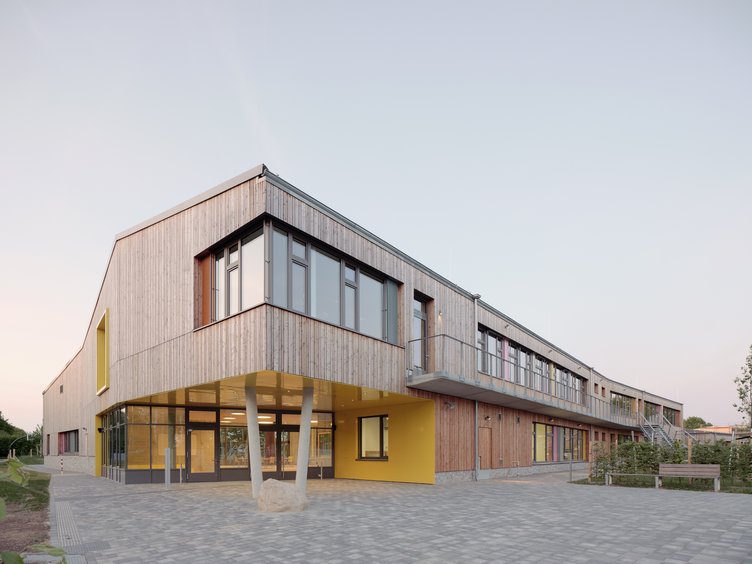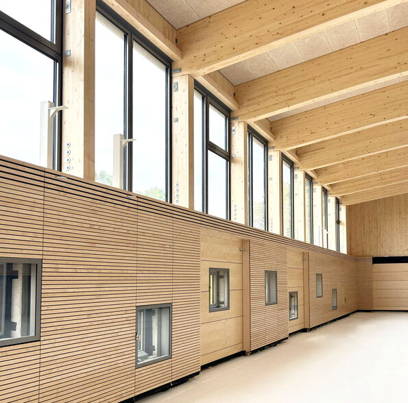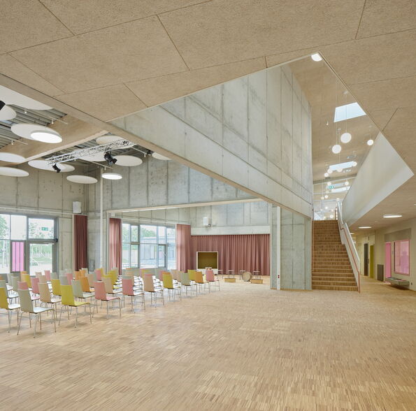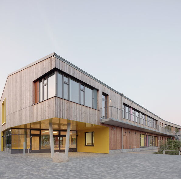 Das Schulgebäude ist ein- bis zweigeschossig, mit unterschiedlichen Konstruktionsarten für verschiedene Gebäudeteile. Die beiden sogenannten "Klassenhäuser" sind vollständig in Holzrahmenbauweise errichtet, während das Hauptgebäude in seinen tragenden Bauteilen als Massivbau aus Kalksandstein-Mauerwerk bzw. Stahlbeton konstruiert wurde. Für die Dächer und Decken wurden in den meisten Teilen vorgespannte Elementdecken verwendet. Der mittlere Teil des Hauptdaches wurde in Holzbauweise als Pfettendach mit Stahlträger errichtet und die Dachkonstruktion über den zweigeschossigen Hallen besteht aus Bindern aus Brettschichtholz und einem darüber liegenden Trapezprofil. Auch die Dächer über den Klassenhäusern sind Pfettendächer aus Holz.