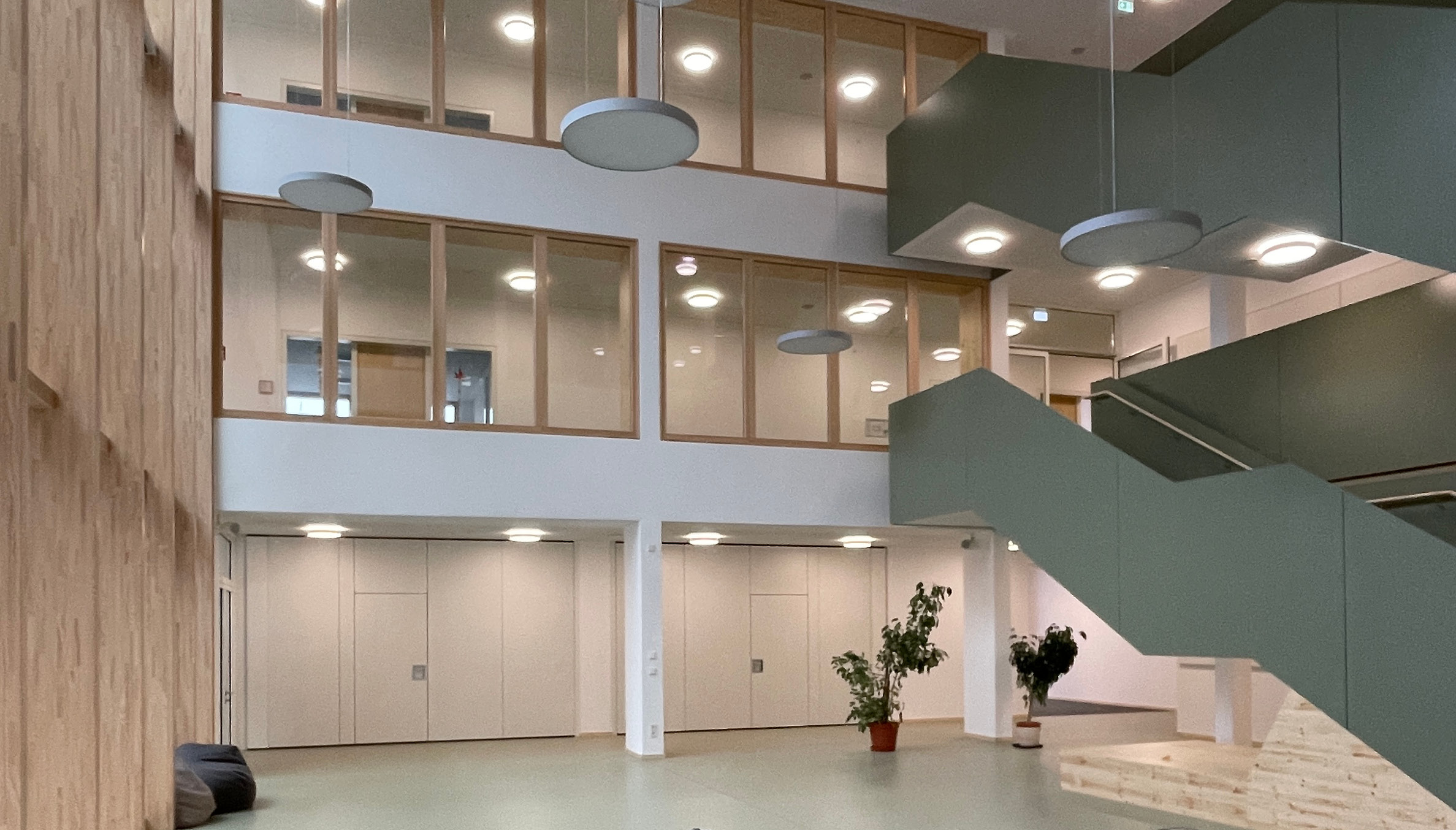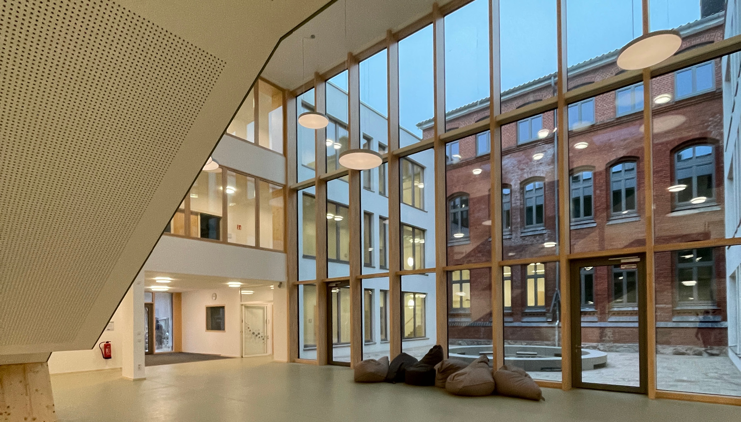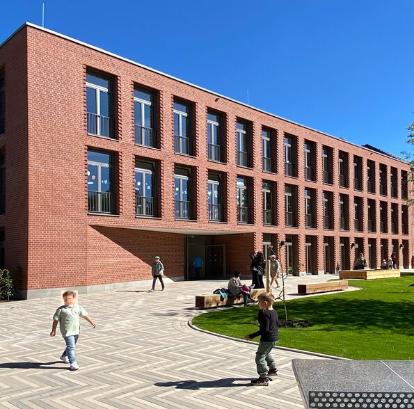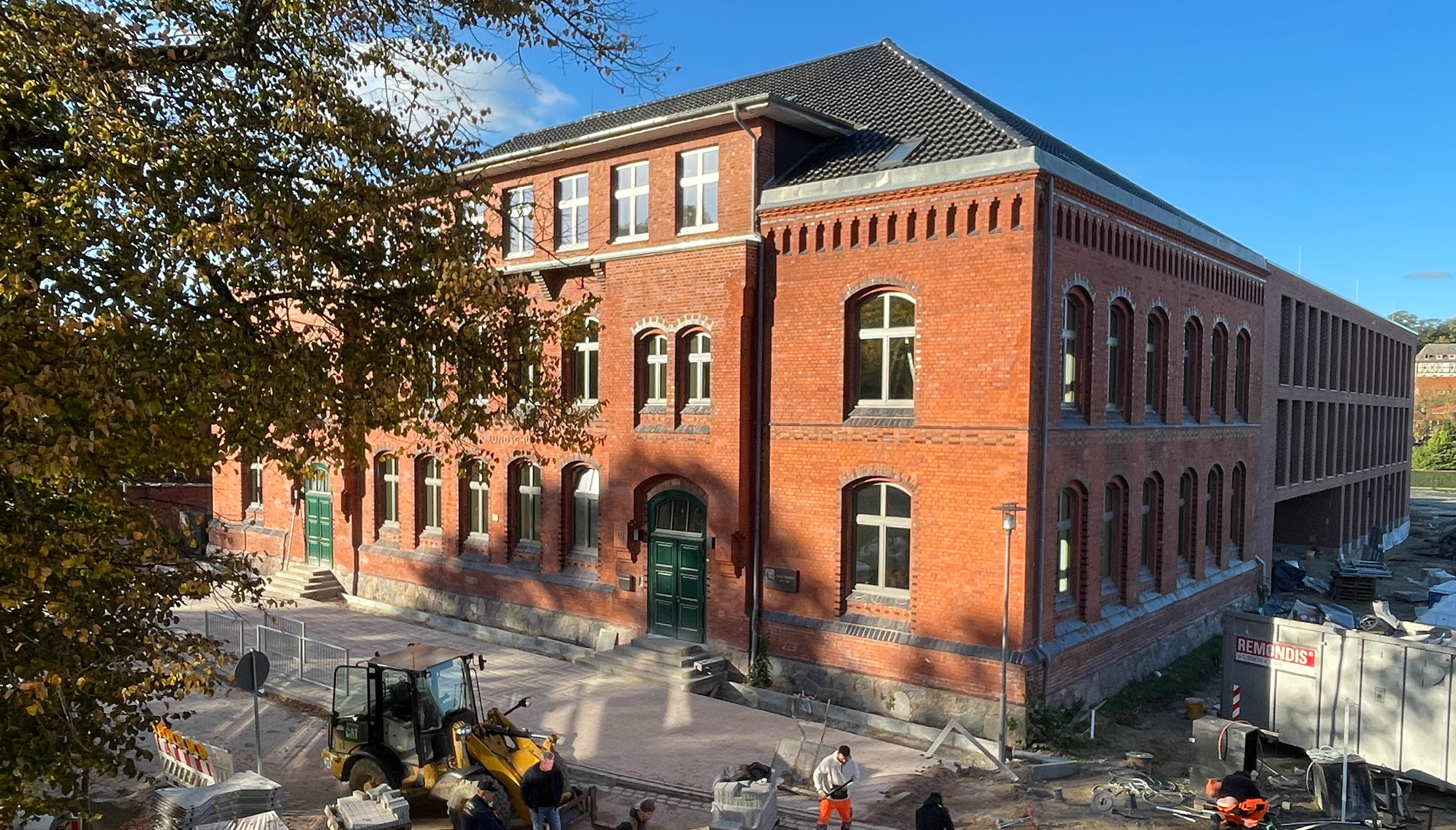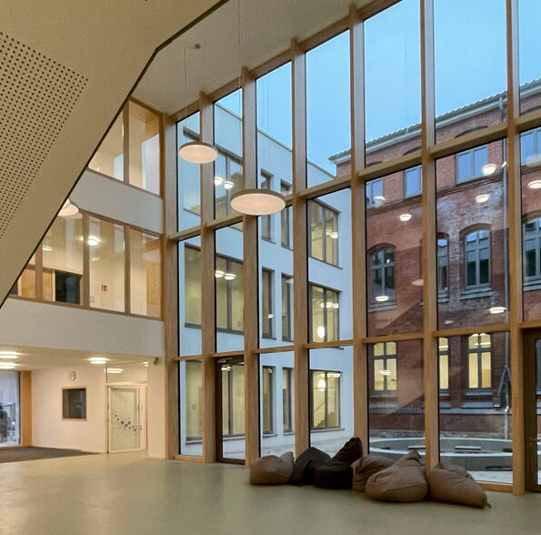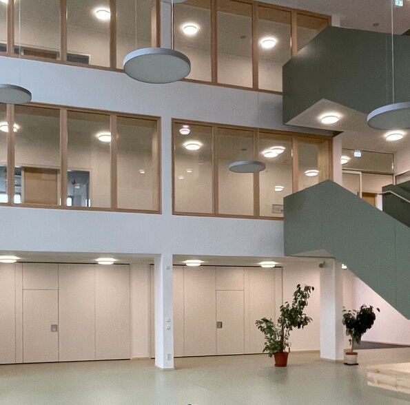 Zusätzlich wurde das freistehende Hortgebäude renoviert und die alte Sporthalle durch eine moderne Zwei-Feld-Halle mit gängigen Nebenräumen ersetzt.