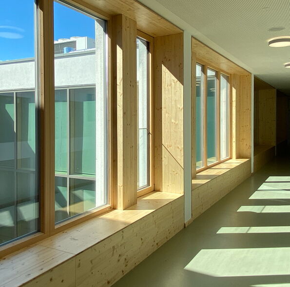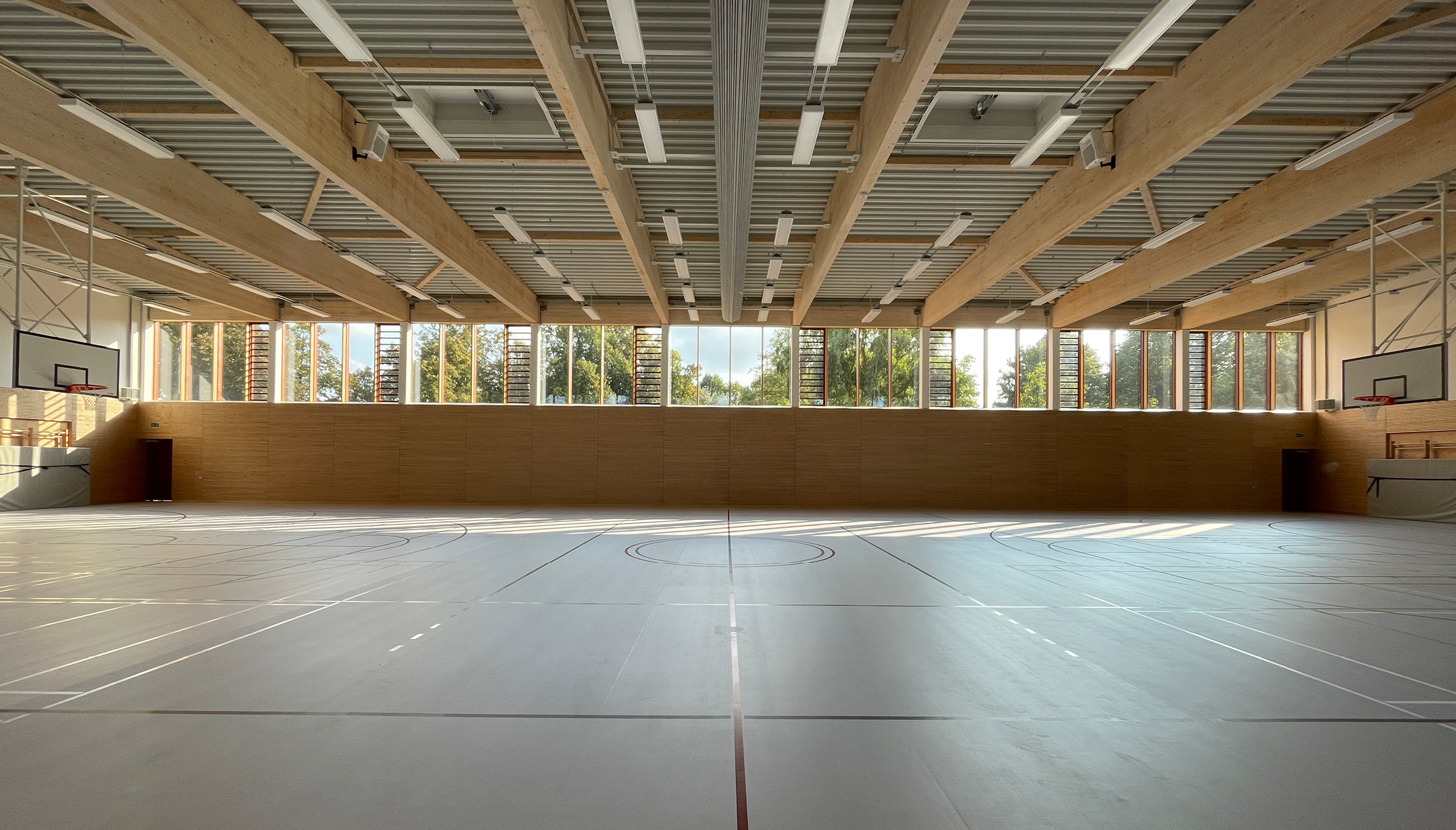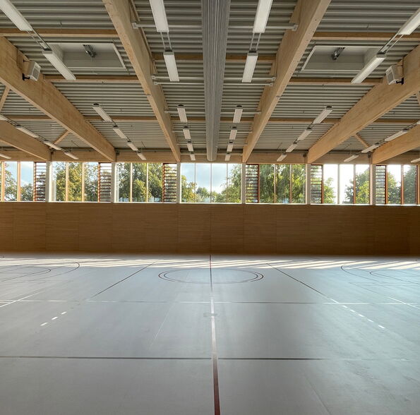 Auch die Sporthalle wird größtenteils als Massivbau ausgeführt. Der flachere, angeschlossenen Nebenraumtrakt übernimmt durch die angeschlossenen Stahlbetonstützen die Aussteifung in Querrichtung. Das Dach über der Halle besteht aus sichtbaren Holzbindern mit Trapezblech, Dämmung und Abdichtung.