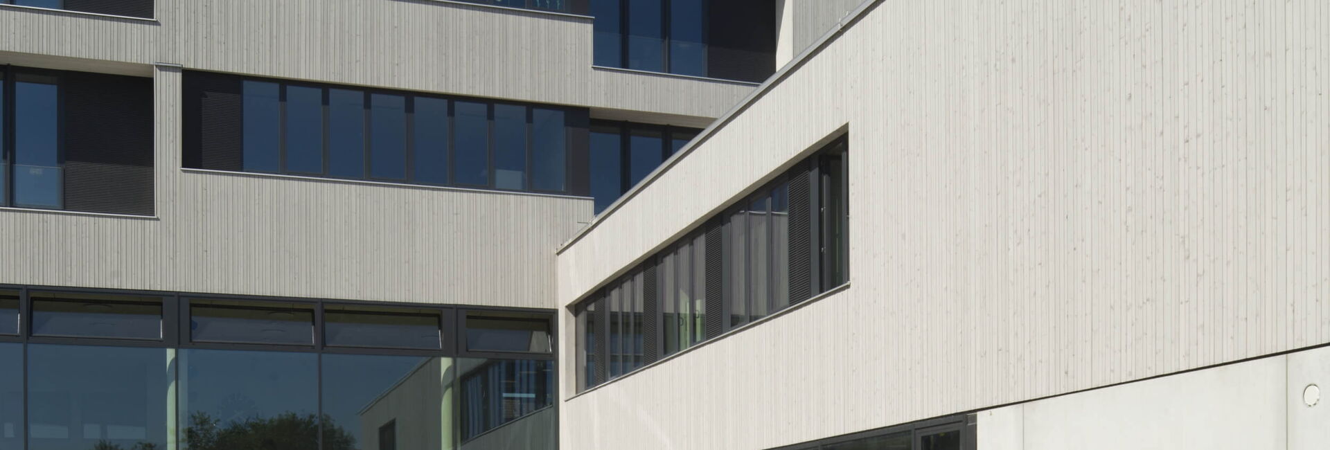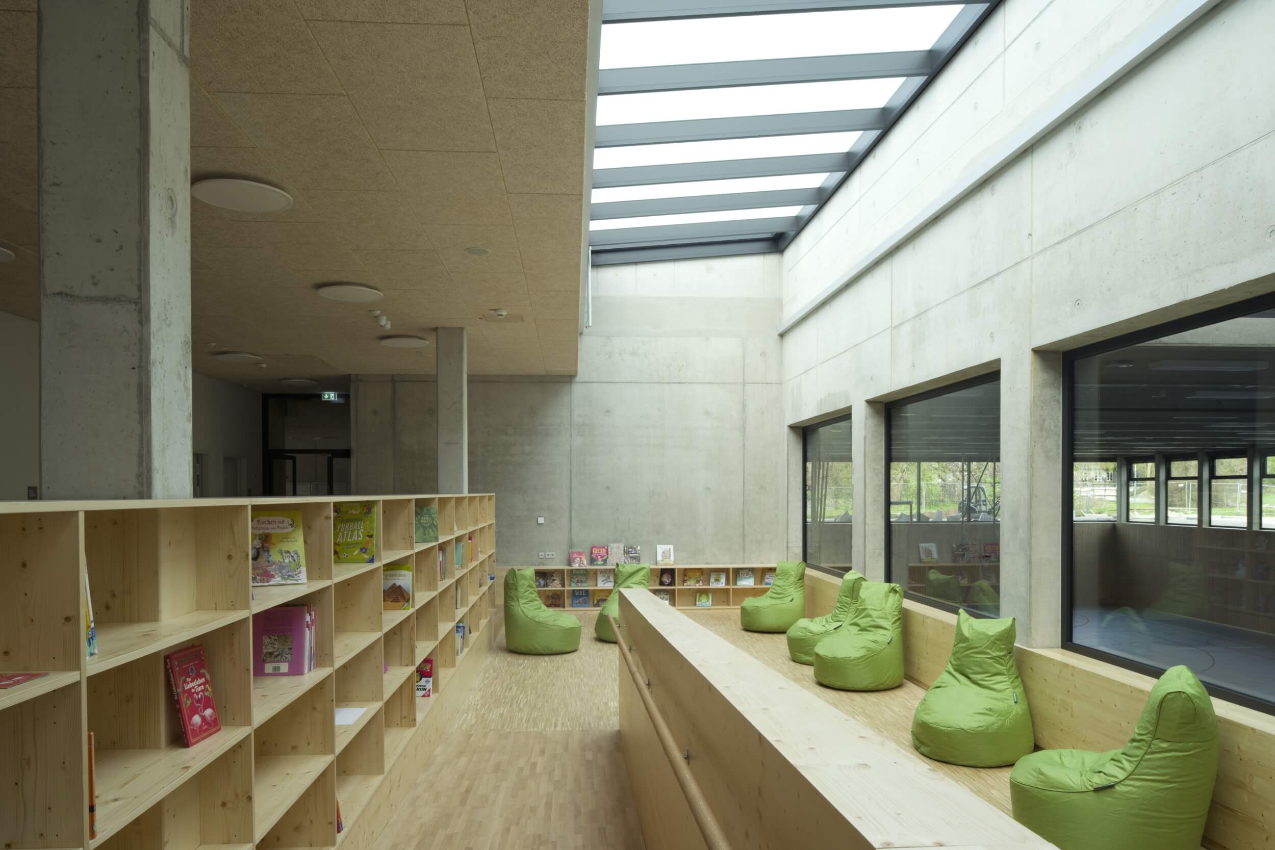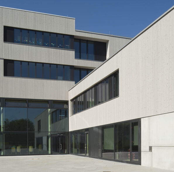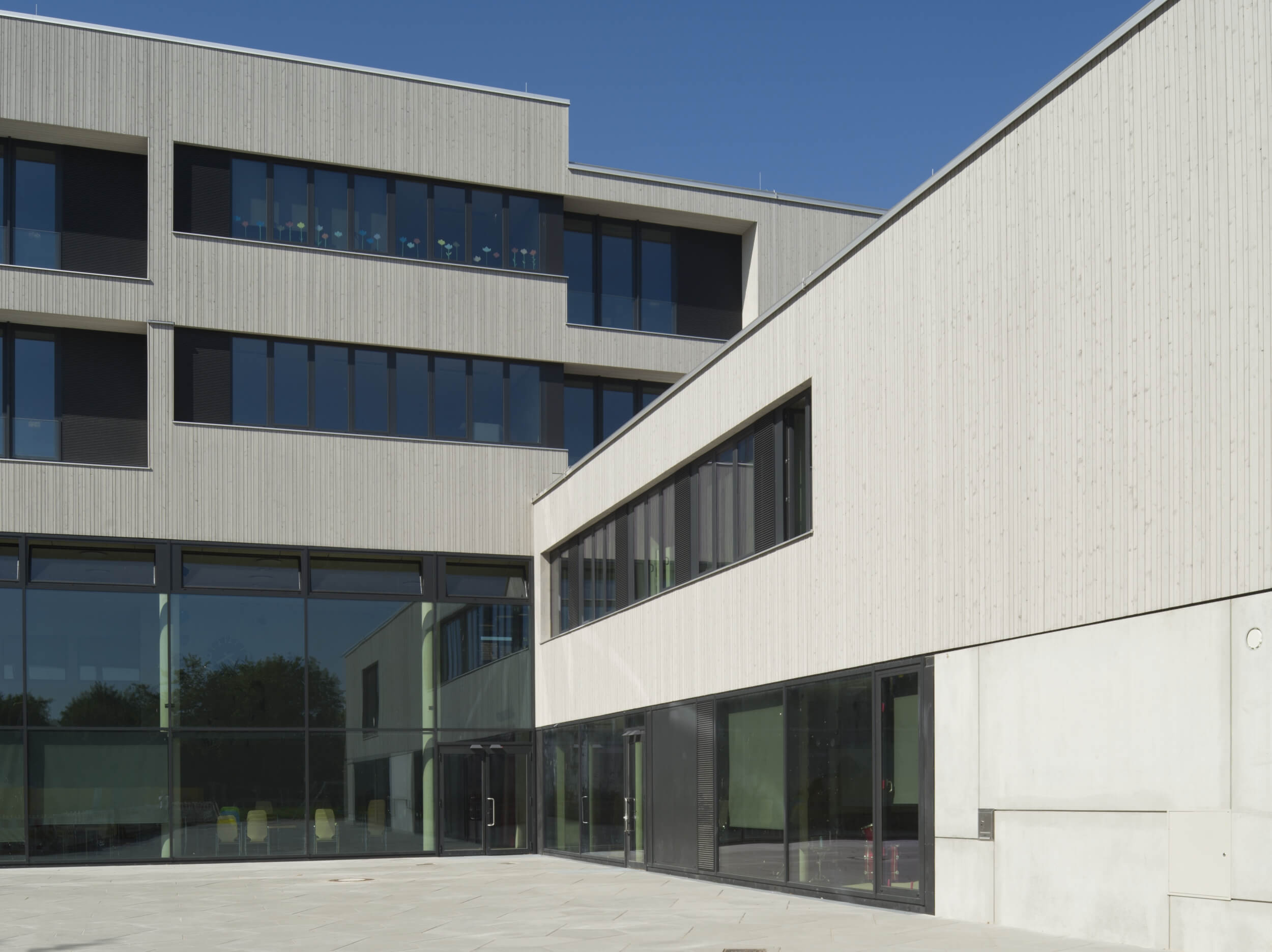 Die Schul- und Kitagebäude sind in unterschiedlichen Abschnitten zwei- bis viergeschossig. Dabei sind die tragenden Konstruktionen massive Bauteile aus Stahlverbund, Stahlbeton oder Mauerwerk. Alle Außenwände sind in Stahlbeton ausgeführt. Die Lastabtragung erfolgt über eine Flachgründung, wofür der Untergrund teilweise ausgetauscht und eine tragende Sohlplatte konzipiert wurde. Die Gesamtaussteifung des Schul- und Kitagebäudes wird über die Stahlbetonwände und Deckenscheiben erzielt. Die integrierte Sporthalle wurde zur Hälfte mit zwei Vollgeschossen überbaut. In diesem Bereich werden die Windlasten von den Stützen aufgenommen und an die Decke und die Kragwand weitergeleitet.